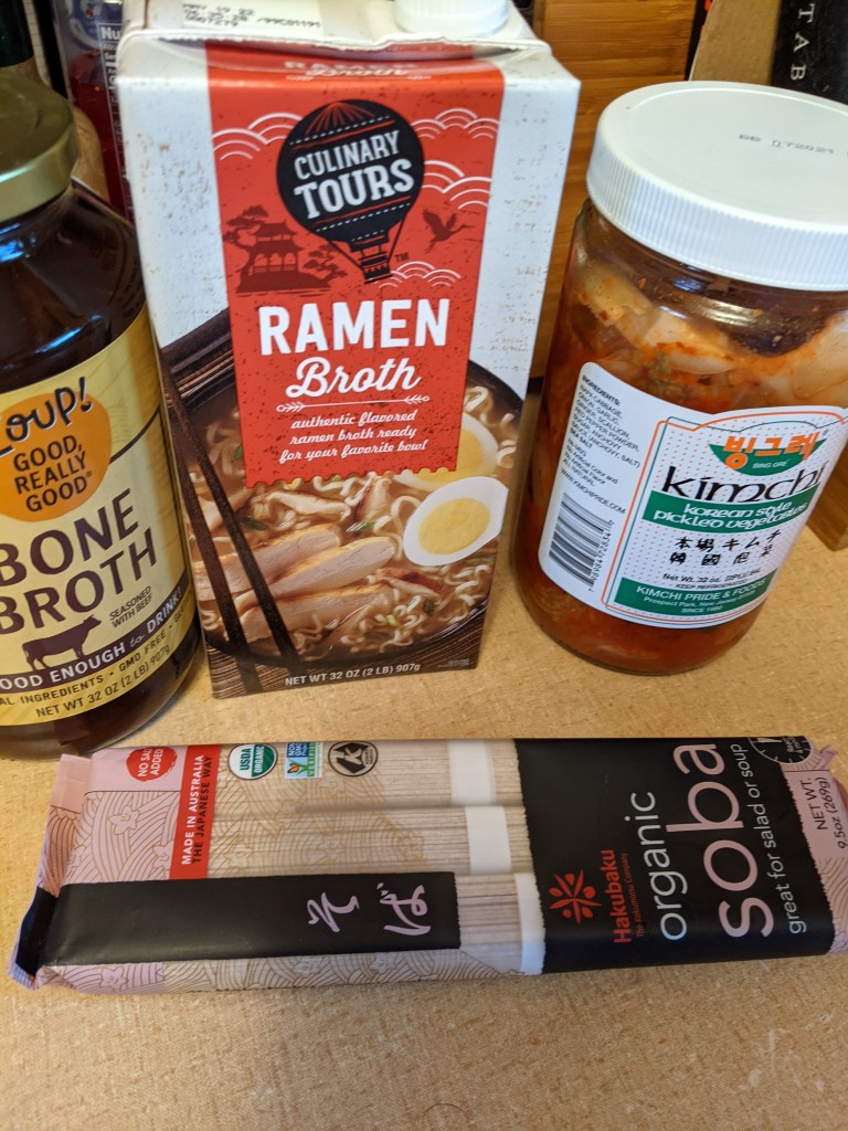 Next, I open up the broths (bone and ramen broths, and ramen base if you have it) and pour them into a larger pot. Let heat up while you open/prep your veggies. (I use canned Asian veggies for easier cooking) Then I grab about a handful of kimchi, dice it up into chunks, then add it to the broth. I then take a couple of tablespoons of the kimchi brine as well. Mix everything together until it cooks. Taste it, and add about a cup of soy sauce and a teaspoon of sesame oil for extra flavor.